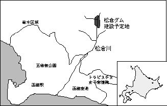 このように松倉川は、函館市の中では数少ない自然の残された河川であるが、ここにダムを建設する計画がある。これが松倉ダムである(図1)。松倉ダムは、洪水防止と水供給を目的とした多目的ダムであり、総事業費は約310億円と見積もられている。