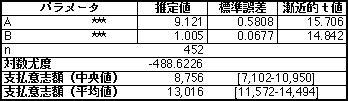 ここで、効用関数の差△Vに対数線形関数を想定し、最尤法によりパラメータaおよびbを推定することで、支払意志額が得られる。尤度関数は以下の通りである。