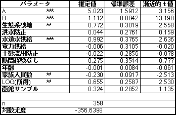 さらに、支払意志額関数の構成要因を分析したところ、表2の結果が得られた。この結果より、ダム開発が生態系に影響を及ぼすと考える人ほど支払意志額が高い傾向にあった。これは評価対象の生態系と評価額とが整合的な関係にあることを示している。また、訪問経験や函館に在住しているか否かは支払意志額には影響していなかった。これは生態系が非利用価値に属しているため、不特定多数の人々に影響が及ぶことを反映している。