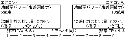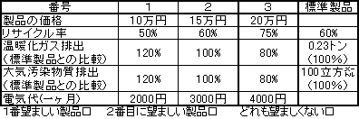ここでは、家庭用エアコンを対象にコンジョイント分析による実証研究を行う。家庭用エアコンの通常性能として冷暖房パワー、消費電力、価格を採用し、それ以外の環境属性としてリサイクル率、温暖化ガス排出、大気汚染物質排出を用いた。このうち、温暖化ガス排出と大気汚染物質排出はライフサイクル・インベントリー分析によって得られたLCA情報である。ここで用いた属性と水準は表1のとおりである。